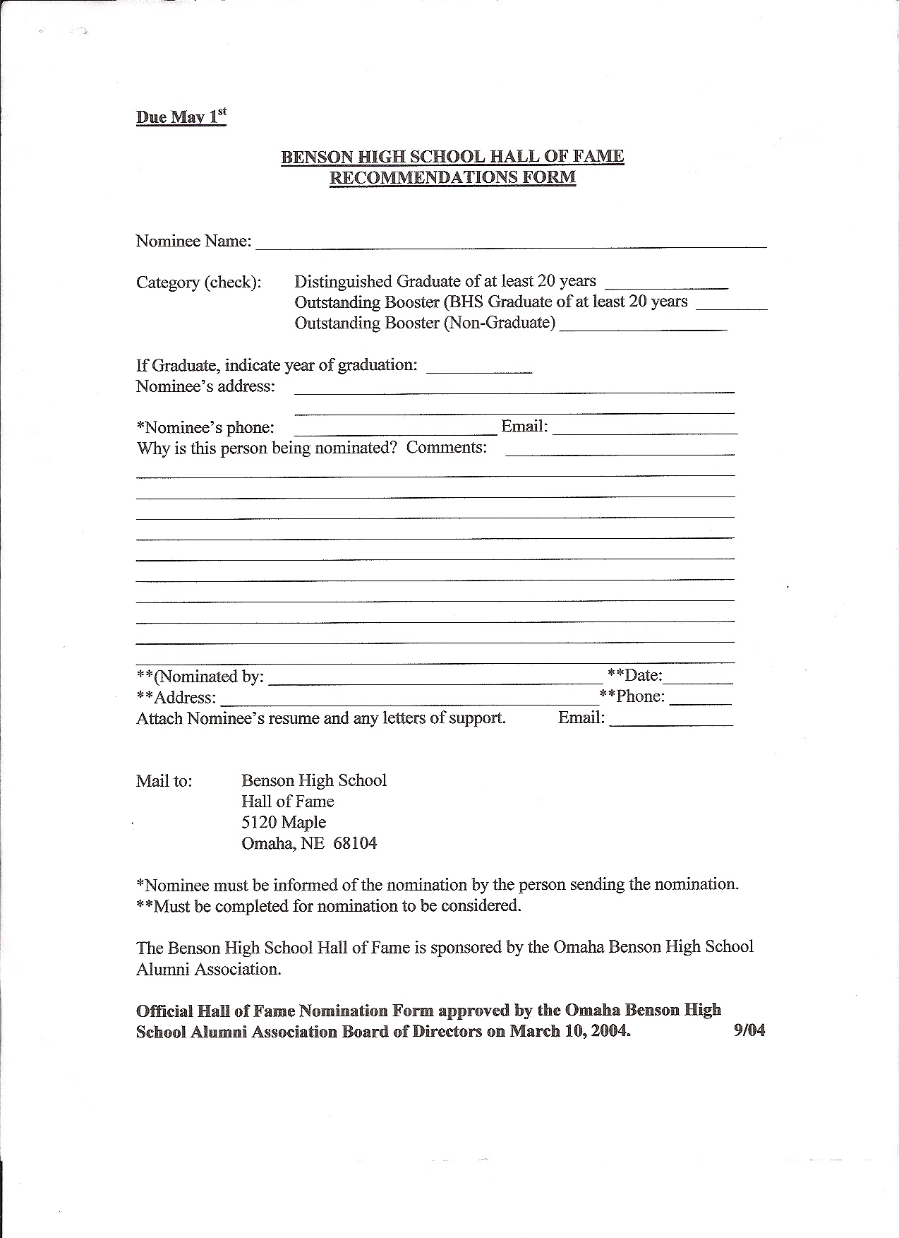 October 1 is the deadline for nominations to be considered for the 2009-10 Benson High School Hall of Fame. The hall of fame ceremonies have been moved from November to the last Friday in April (April 30 in 2010).